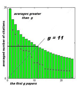 در این شاخص بر خلاف شاخص هرش به مقالاتی که بیشتر مورد استناد قرار میگیرد وزن بیشتری داده میشود. بنا به تعریف شاخص g برابر است با بالاترین رتبه در لیست نزولی مقالات به ترتیبی که g مقاله اول حداقل تعداد g2 استناد دریافت کرده باشند و مجموع استنادهای مقالات تا g بزرگتر یا مساوی g2 باشد. با توجه و دقت در نحوه محاسبه G-Index در مییابیم که میزان G-Index هیچ وقت کمتر از H-Index نخواهد بود.